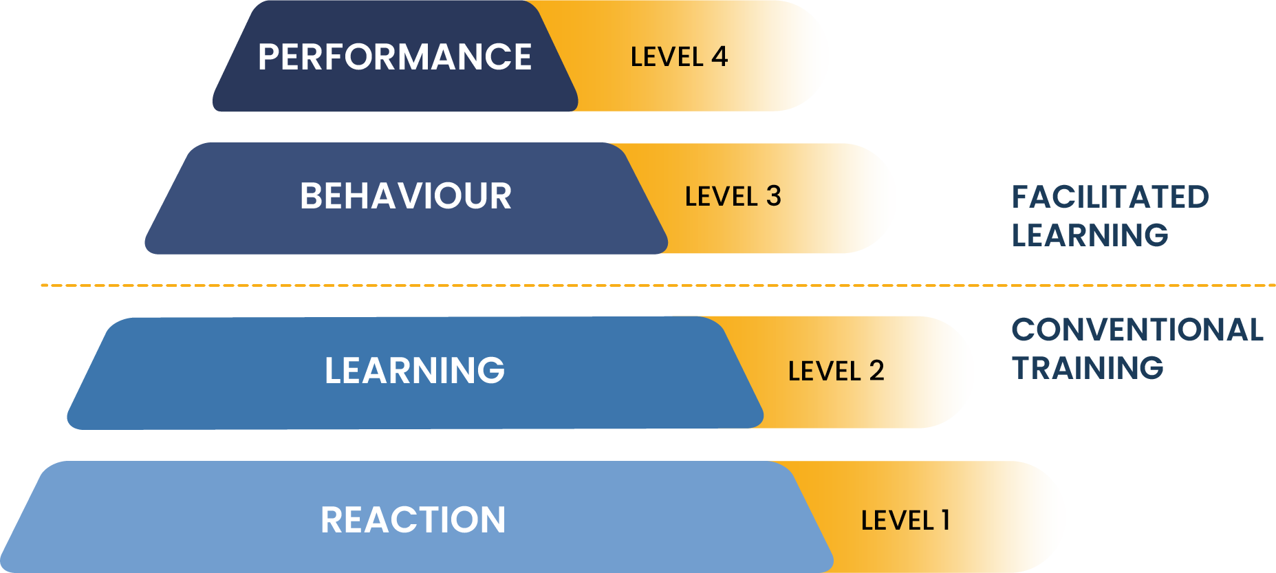 At Gtrust, our 'Facilitated Learning' approach stands out due to its effectiveness in achieving results beyond traditional training methods. While conventional training often focuses on the 'learning' phase, our facilitative and highly participatory approach takes participants to the 'impact' level, resulting in meaningful behavior change.